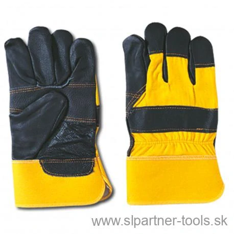 Vrch rukavíc a tuhá manžeta sú zo žltej bavlnenej tkaniny.